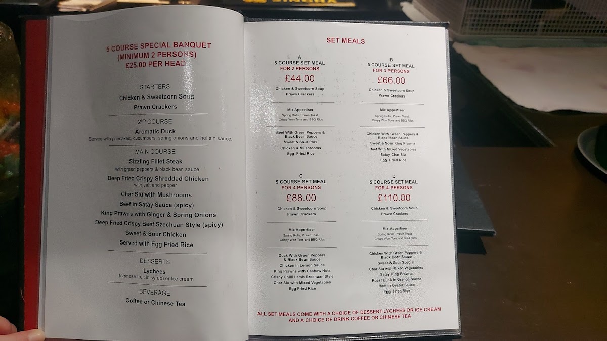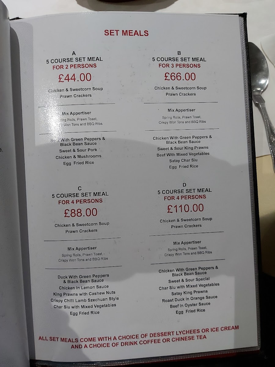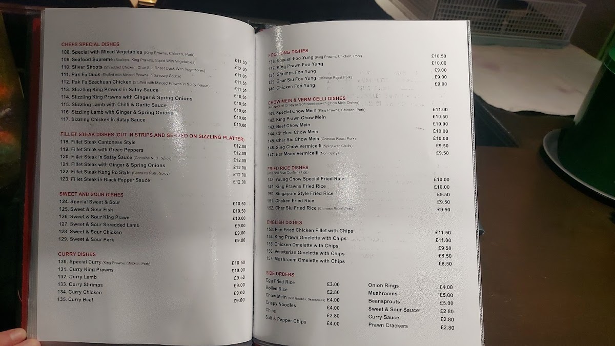 You’ll find options ranging from light starters like prawn crackers and mixed platters to heartier main courses such as sweet and sour chicken, mushroom curry chow mein, and the classic Peking duck. Soups like crabmeat and sweetcorn add a soothing touch, while dishes like sizzling shredded fillet steak Cantonese style bring a satisfying, aromatic richness to the table.